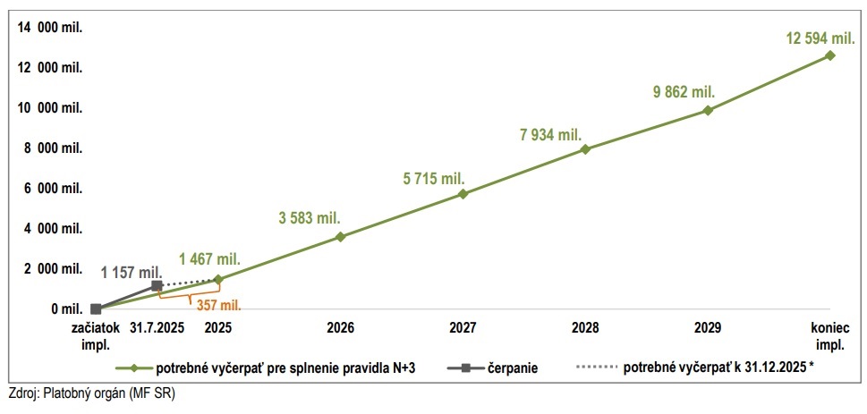 Ministerstvo financií informovalo, že z celkovej alokácie eurofondov Slovensko ku koncu júla 2025 vyčerpalo 1,17 miliardy z 12,79 miliardy eur. Do konca tohto roka však musí minúť ešte minimálne 357,8 milióna, inak časť pridelených peňazí prepadne.