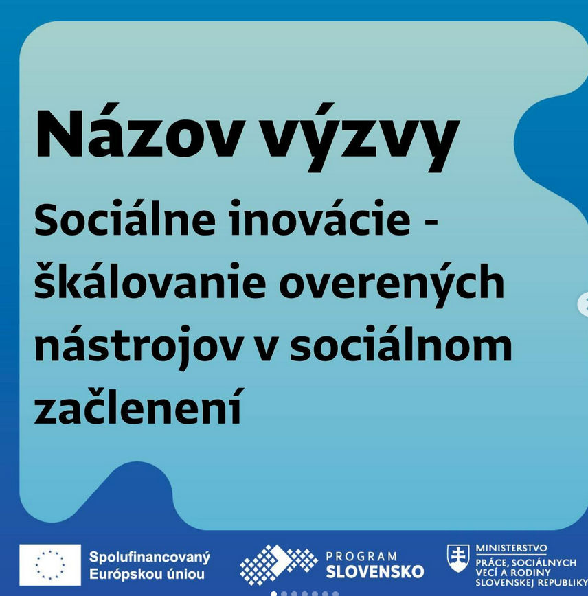 Ministerstvo práce, sociálnych vecí a rodiny SR vyhlásilo výzvu „Sociálne inovácie – škálovanie overených nástrojov v sociálnom začlenení“ s celkovou alokáciou 10 miliónov eur z európskych zdrojov v rámci Programu Slovensko.