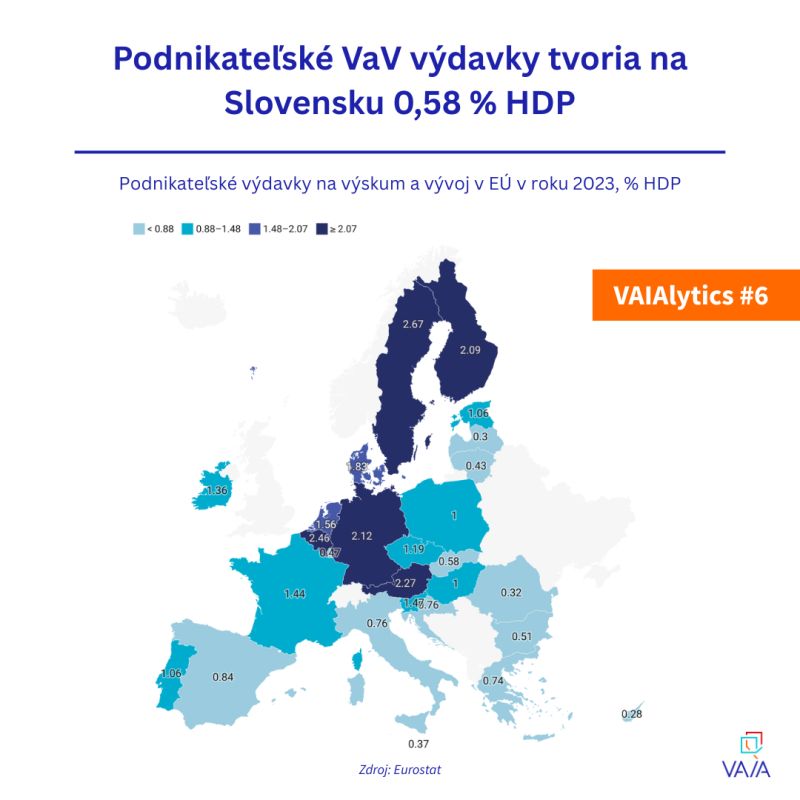 Podnikateľský sektor na Slovensku v roku 2023 investoval do výskumu a vývoja (VaV) doposiaľ najviac a to 0,58 % HDP. Pre porovnanie, európsky priemer dosahuje 1,5 % HDP a najinovatívnejšie krajiny presahujú hranicu 2 %.