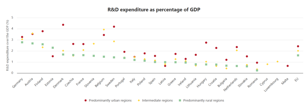 Vidiecke regióny na druhej strane investujú v priemere 1,6 % svojho HDP. Napriek tomu viac ako 20 % vidieckych regiónov dosahuje lepšie výsledky, ako je celkový priemer intenzity výskumu a vývoja v EÚ – pozoruhodnými príkladmi sú regióny v západnom Nemecku (Bautzen, Helmstedt), Hornom Rakúsku (Traunviertel, Innviertel) a juhozápadnom Francúzsku (Lot, Tarn-et-Garonne), kde investície do výskumu a vývoja presahujú 3 % HDP.