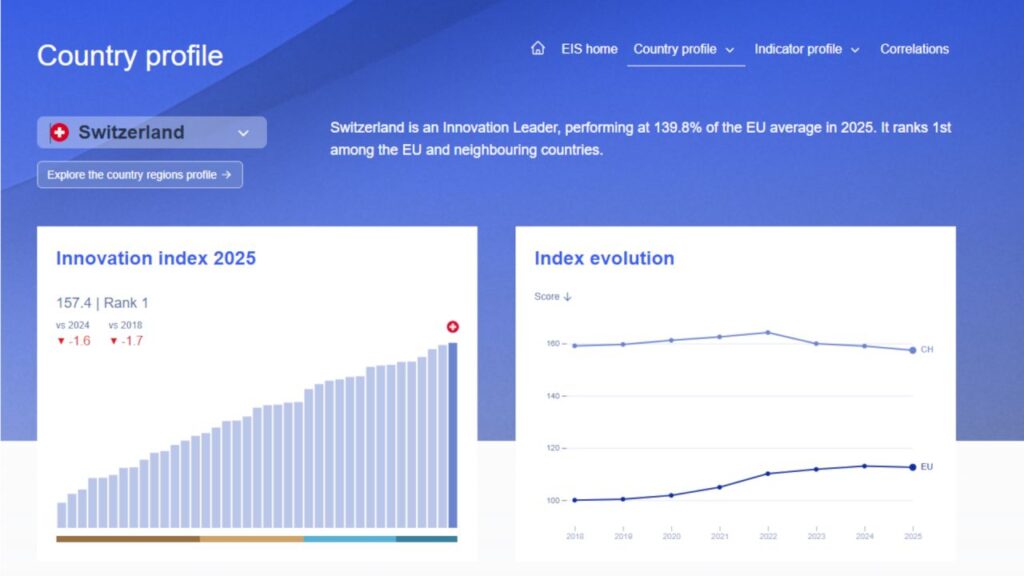 Švajčiarsko vedie rebríček inovácií Európskej komisie už osem rokov po sebe. Správa EIS z roku 2025, ktorá porovnáva 27 členských štátov Európskej únie (EÚ) a dvanásť ďalších európskych krajín, bola zverejnená 15. júla 2025.
