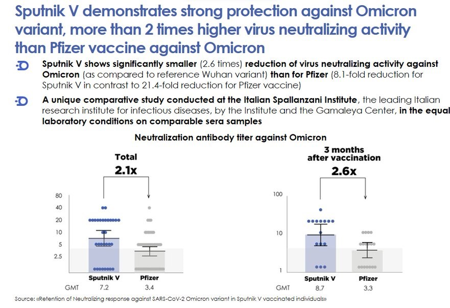 Podľa štúdie, ktorú vykonal Spallanzani Institute v Ríme, popredný taliansky výskumný ústav pre infekčné choroby, vakcína Sputnik V indukuje viac ako dvakrát vyššie hladiny protilátok neutralizujúcich vírus variantu Omicron ako dve dávky vakcíny Pfizer/BioNTech.