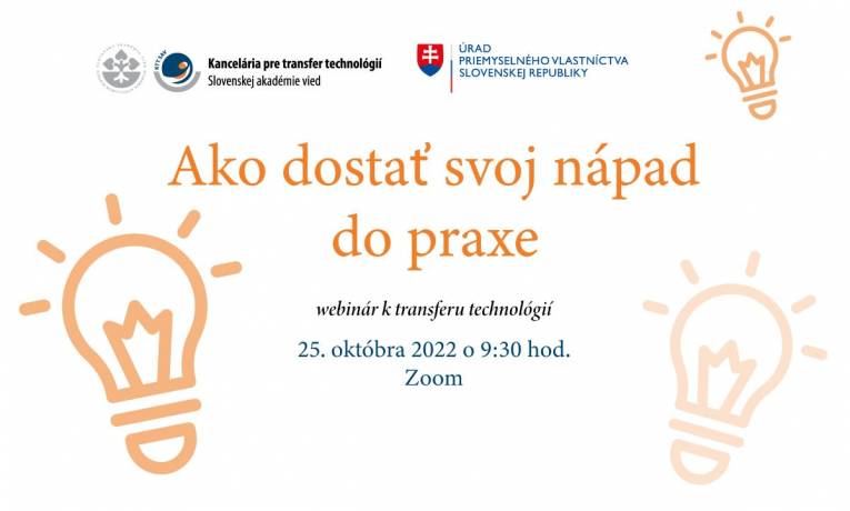 Kancelária pre transfer technológií SAV pozýva záujemcov na webinár Ako dostať svoj nápad do praxe. Podujatie organizuje 25. októbra 2022 od 9:30 do 11:00 v spolupráci s Úradom priemyselného vlastníctva SR.