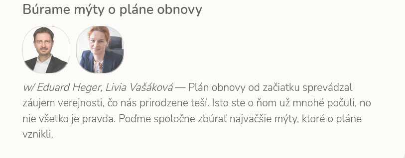 11. marec 2021, 18:00. Online diskusia s ministrom financií SR Eduardom Hegerom a generálnou riaditeľkou sekcie plánu obnovy na Ministerstve financií SR Líviou Vašákovou.