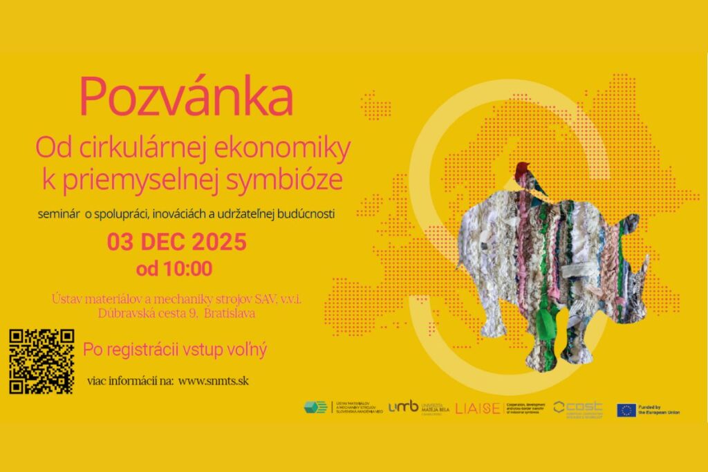 Ústav materiálov a mechaniky strojov SAV, pozýva odbornú aj širšiu verejnosť na odborný seminár zameraný na priemyselnú symbiózu – moderný prístup, ktorý mení spôsob, akým krajiny využívajú zdroje, nakladajú s odpadom a prepájajú priemyselné odvetvia. Podujatie sa uskutoční 3. decembra 2025 o 10.00 h v priestoroch Ústavu materiálov a mechaniky strojov SAV, v. v. i., Dúbravská cesta 9 v Bratislave.