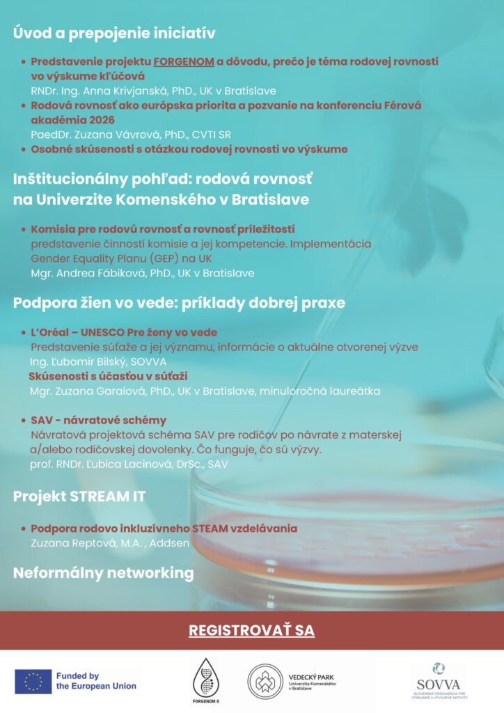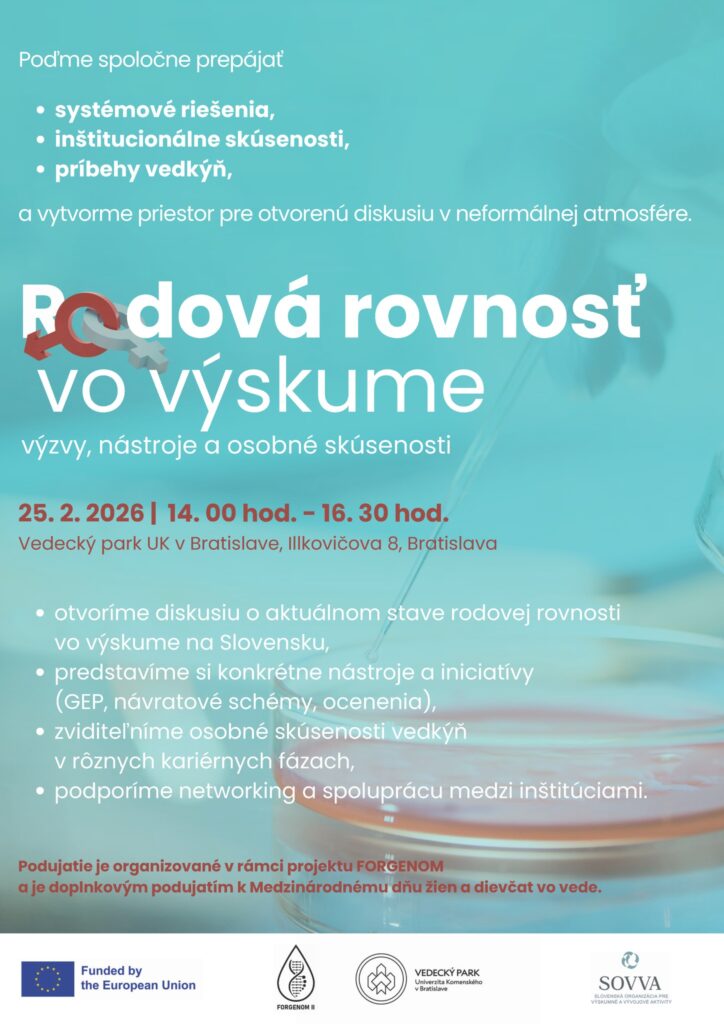 Ako partner podujatia organizovaného Vedeckým parkom Univerzity Komenského v Bratislave v rámci projektu FORGENOM vás SOVVA pozýva na odbornú diskusiu Rodová rovnosť vo výskume – výzvy, nástroje a osobné skúsenosti.