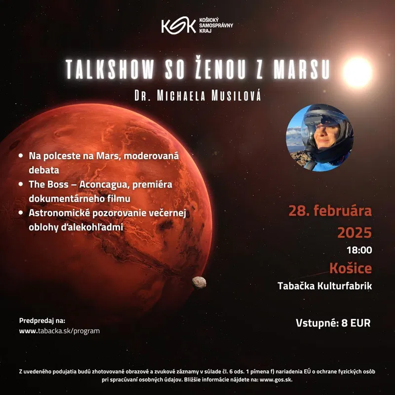 Košická župa spolu s hvezdárňami Košického kraja pokračuje v sérii jedinečných stretnutí so svetoznámou slovenskou astrobiologičkou a marsonautkou Michaelou Musilovou. Po minuloročných úspešných prednáškach v Rožňave, Michalovciach a Trebišove, zavíta koncom februára do Spišskej Novej Vsi a Košíc.