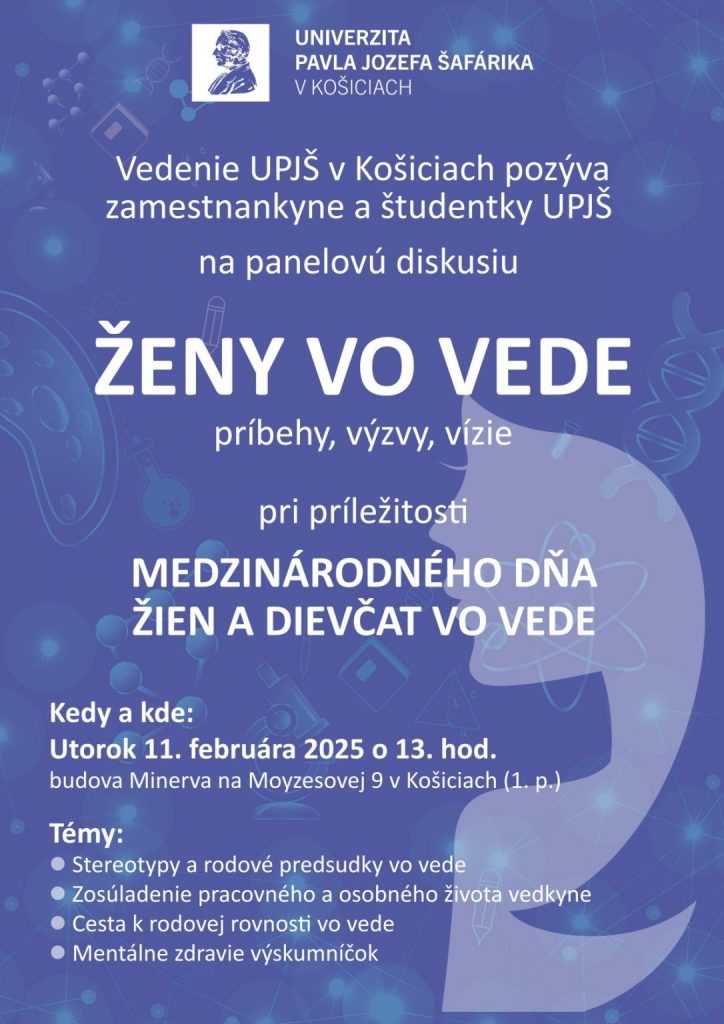Vedenie UPJŠ v Košiciach pozýva zamestnankyne a študentky na panelovú diskusiu “Ženy vo vede: Príbehy, výzvy, vízie”. Podujatie sa uskutoční pri príležitosti Medzinárodného dňa žien a dievčat vo vede 11. februára 2025 o 13:00.
