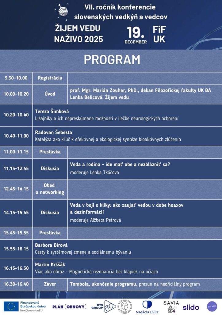 Návštevníkov podujatia, vedcov a vedkyne čaká deň plný inšpiratívnych prednášok, diskusií a stretnutí s ľuďmi, ktorí žijú vedu naplno. Tešiť sa môžu na bohatý program, priestor na networking, ako aj sprievodné aktivity, ktoré spríjemnia celý priebeh podujatia.
